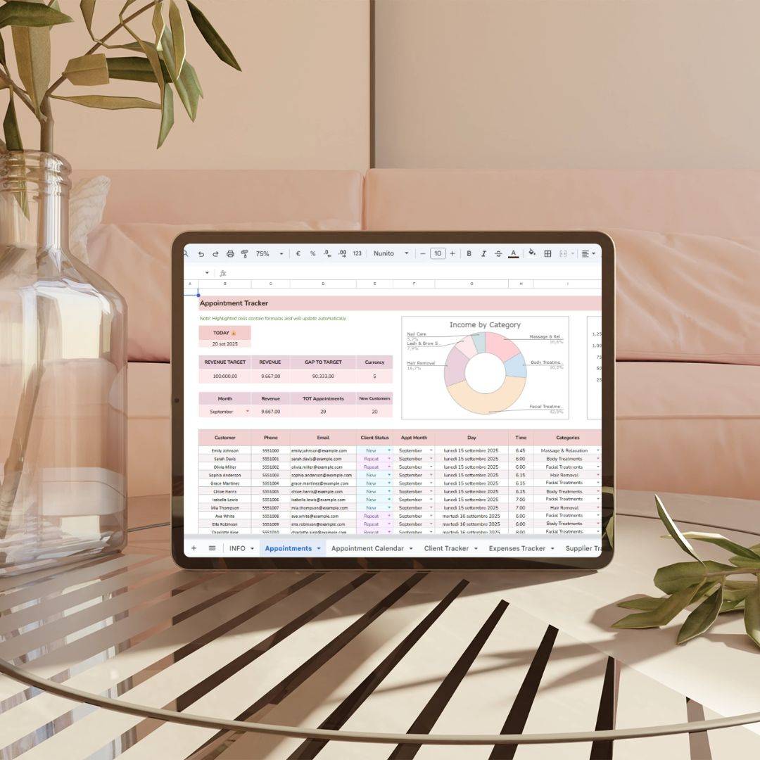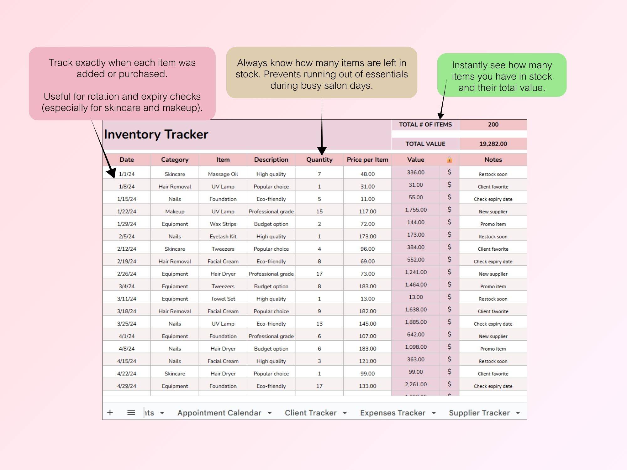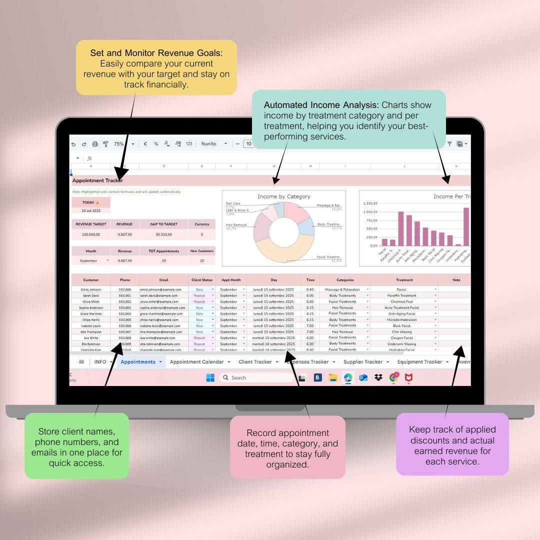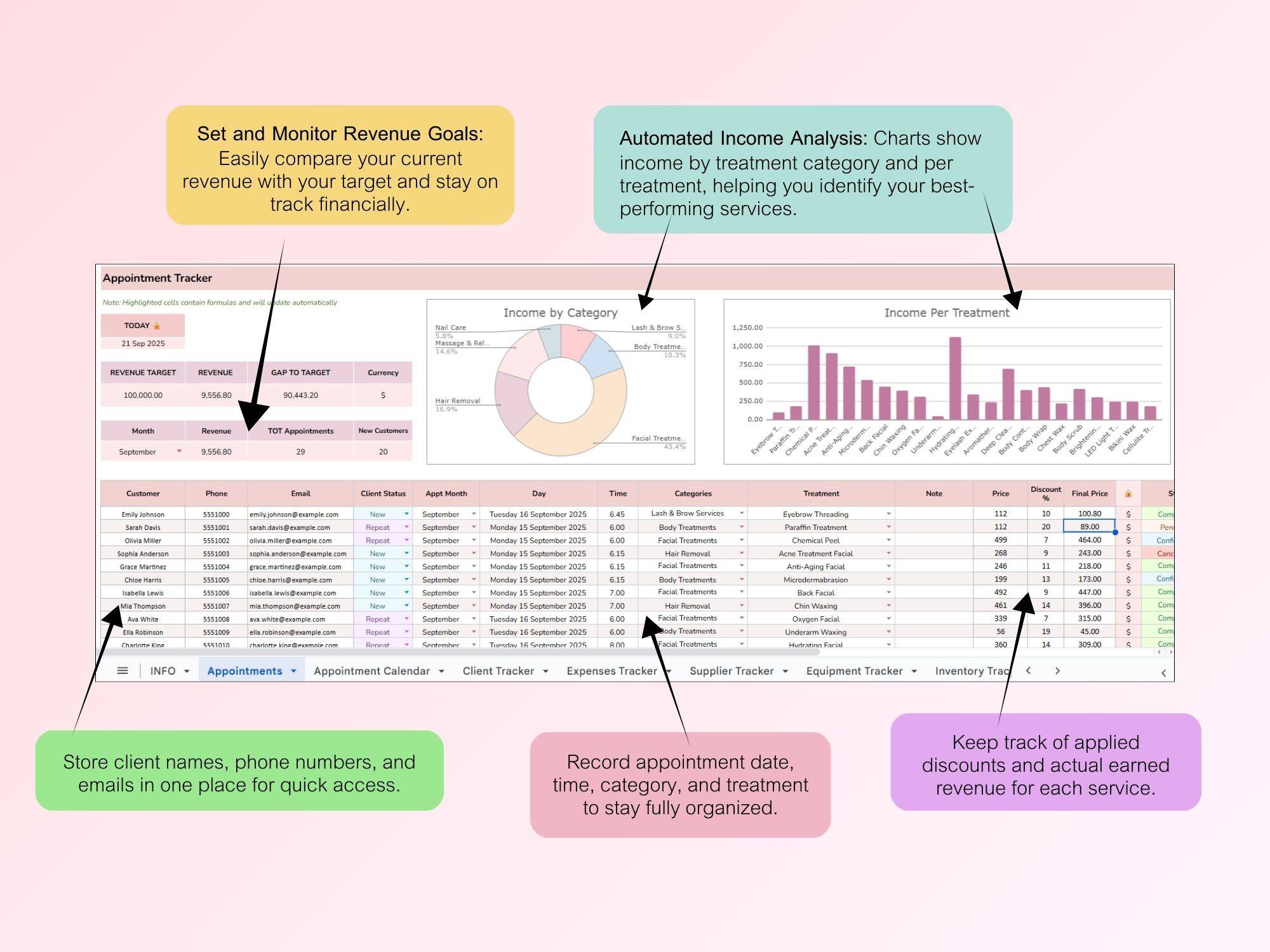 This simple, ready-to-use spreadsheet is every esthetician’s dream. Just download, open, and start organizing your salon right away. Add appointments, track expenses, update inventory — everything updates automatically, with no complicated setup required.