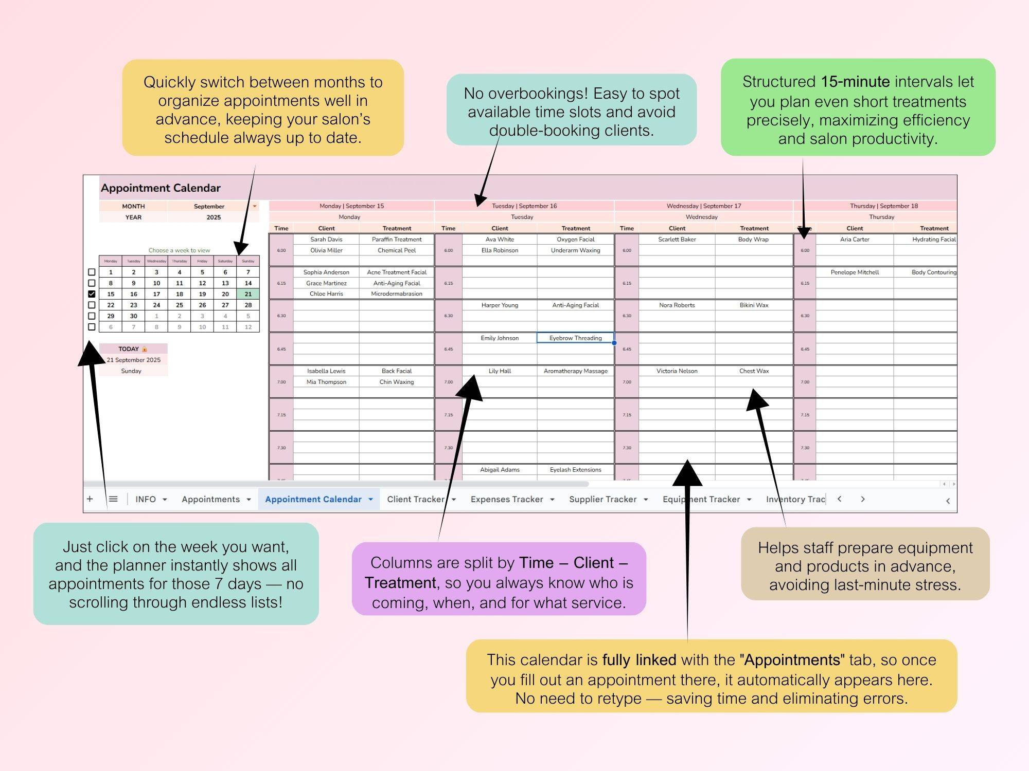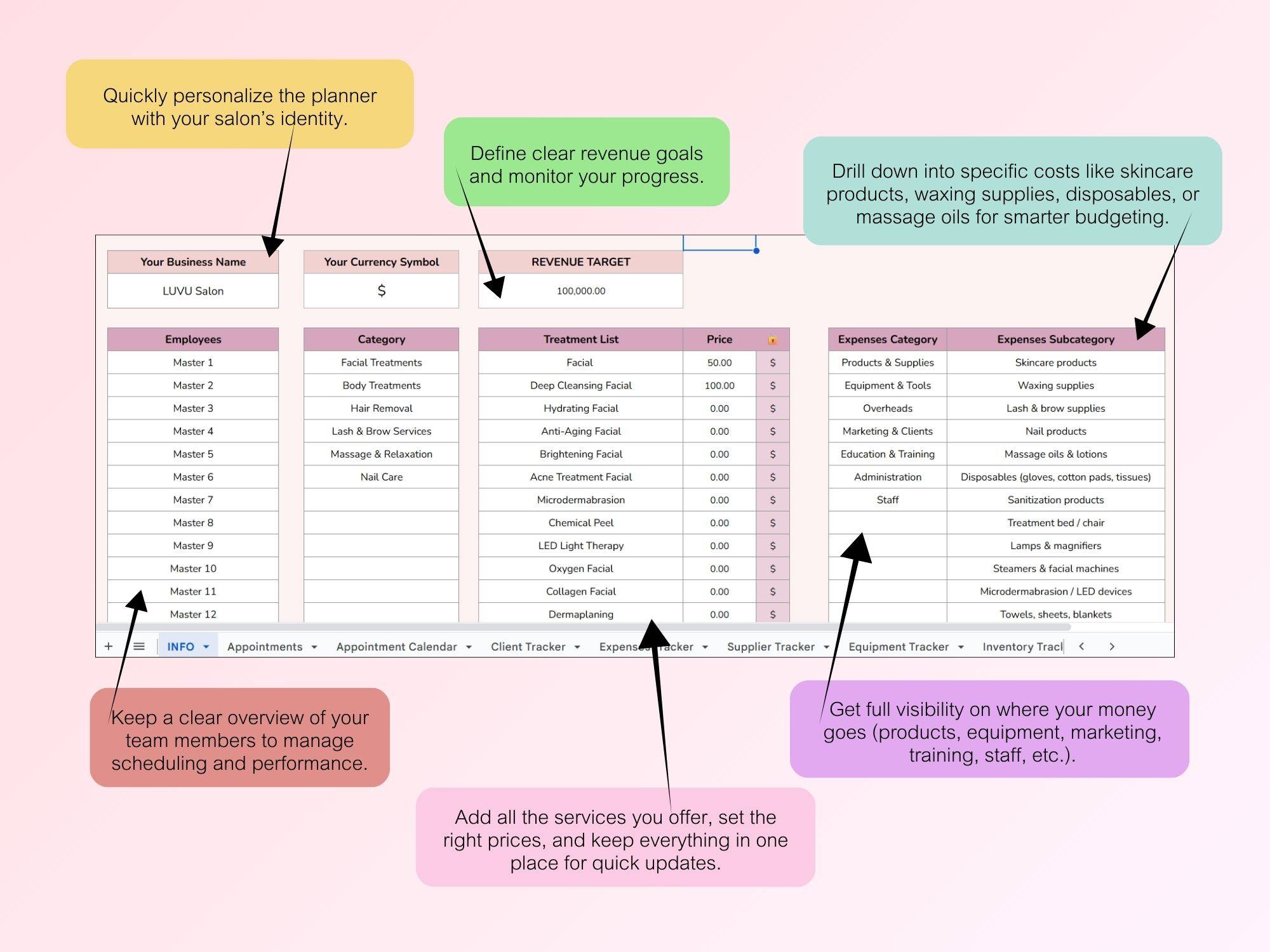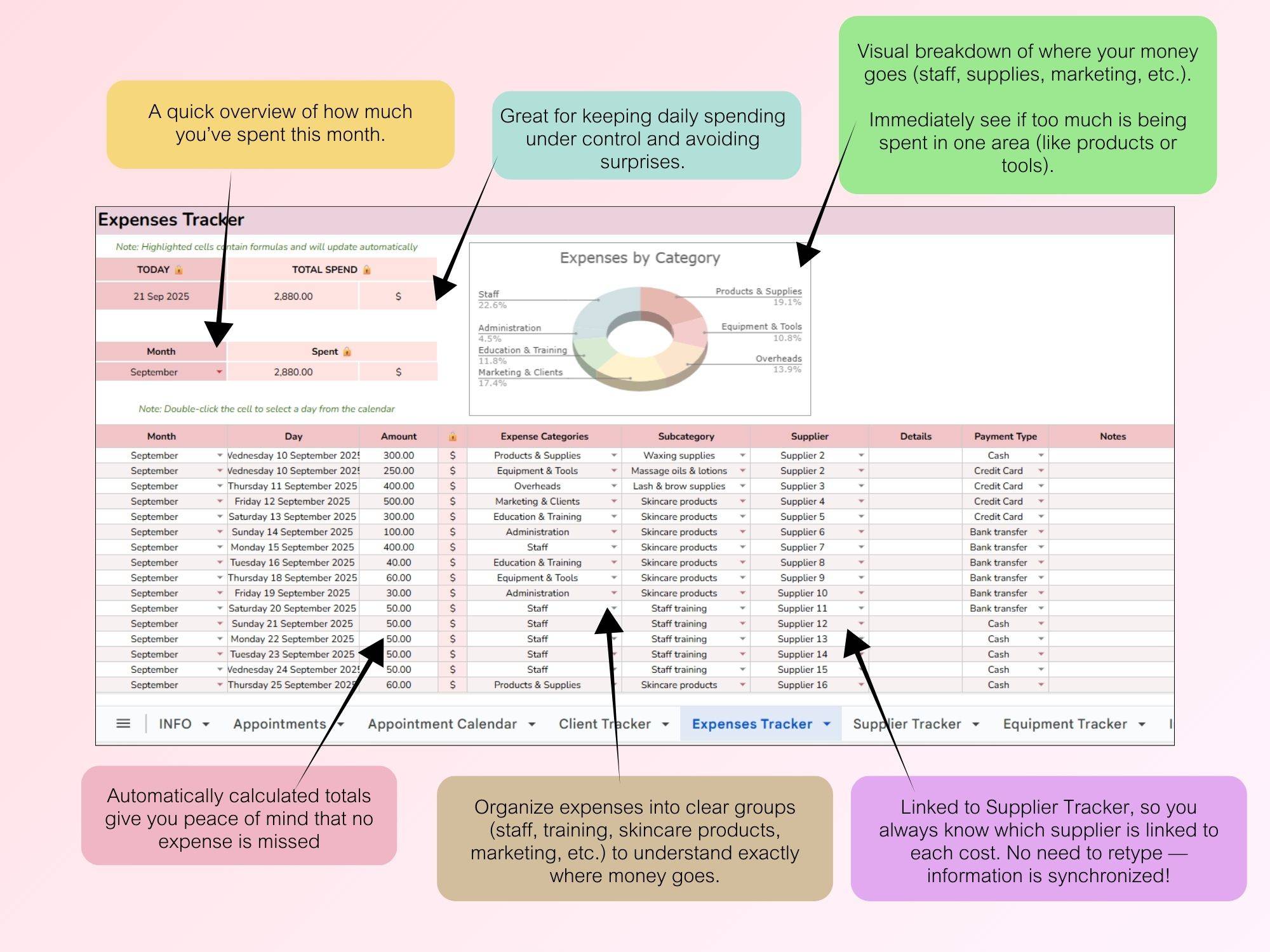 This simple, ready-to-use spreadsheet is every esthetician’s dream. Just download, open, and start organizing your salon right away. Add appointments, track expenses, update inventory — everything updates automatically, with no complicated setup required.