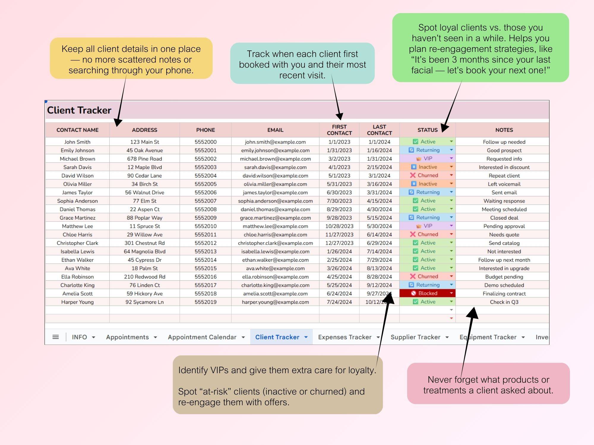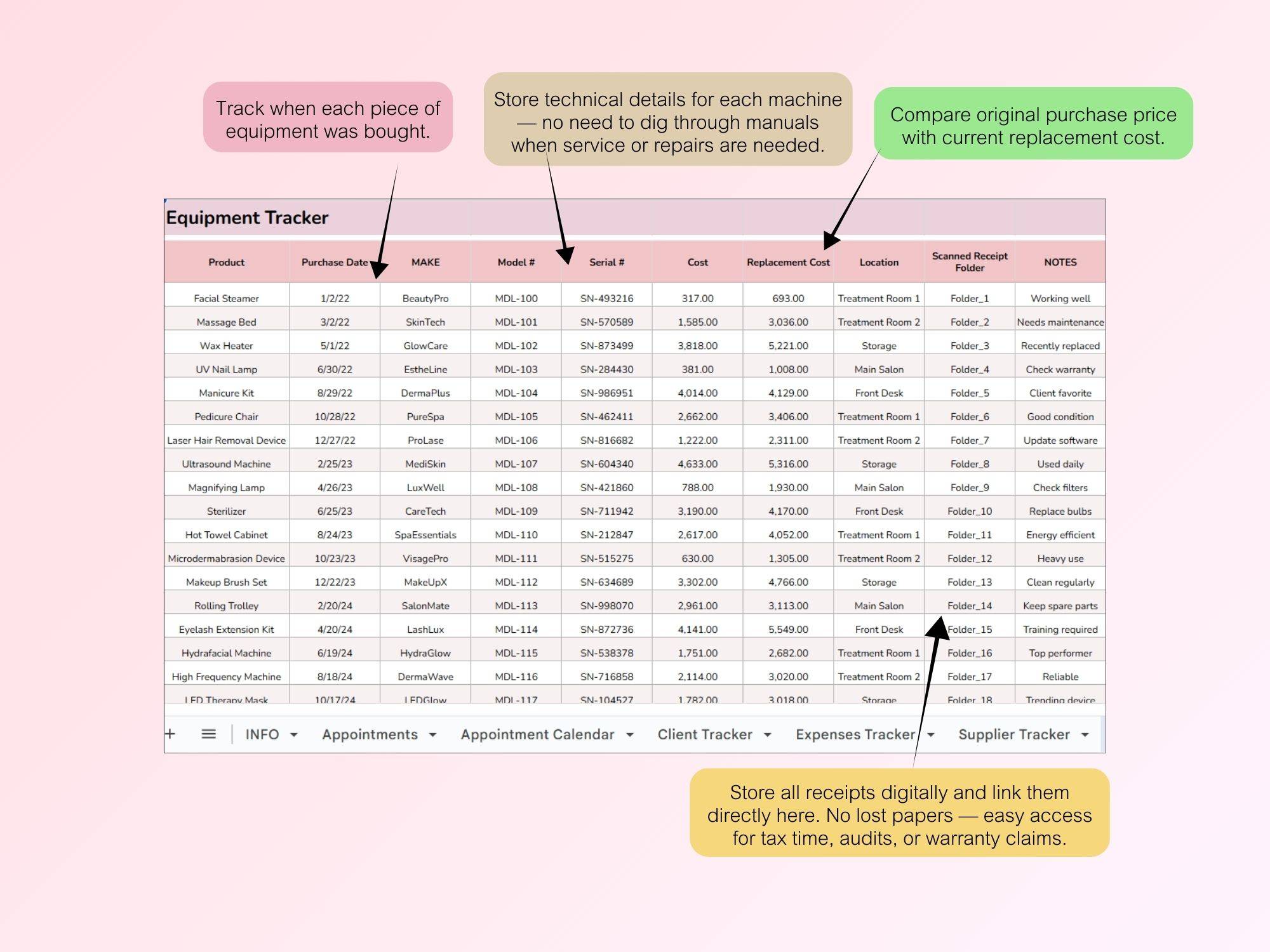 Imagine this…Instead of panicking over missed appointments or lost receipts, you open one Google Sheet and see: