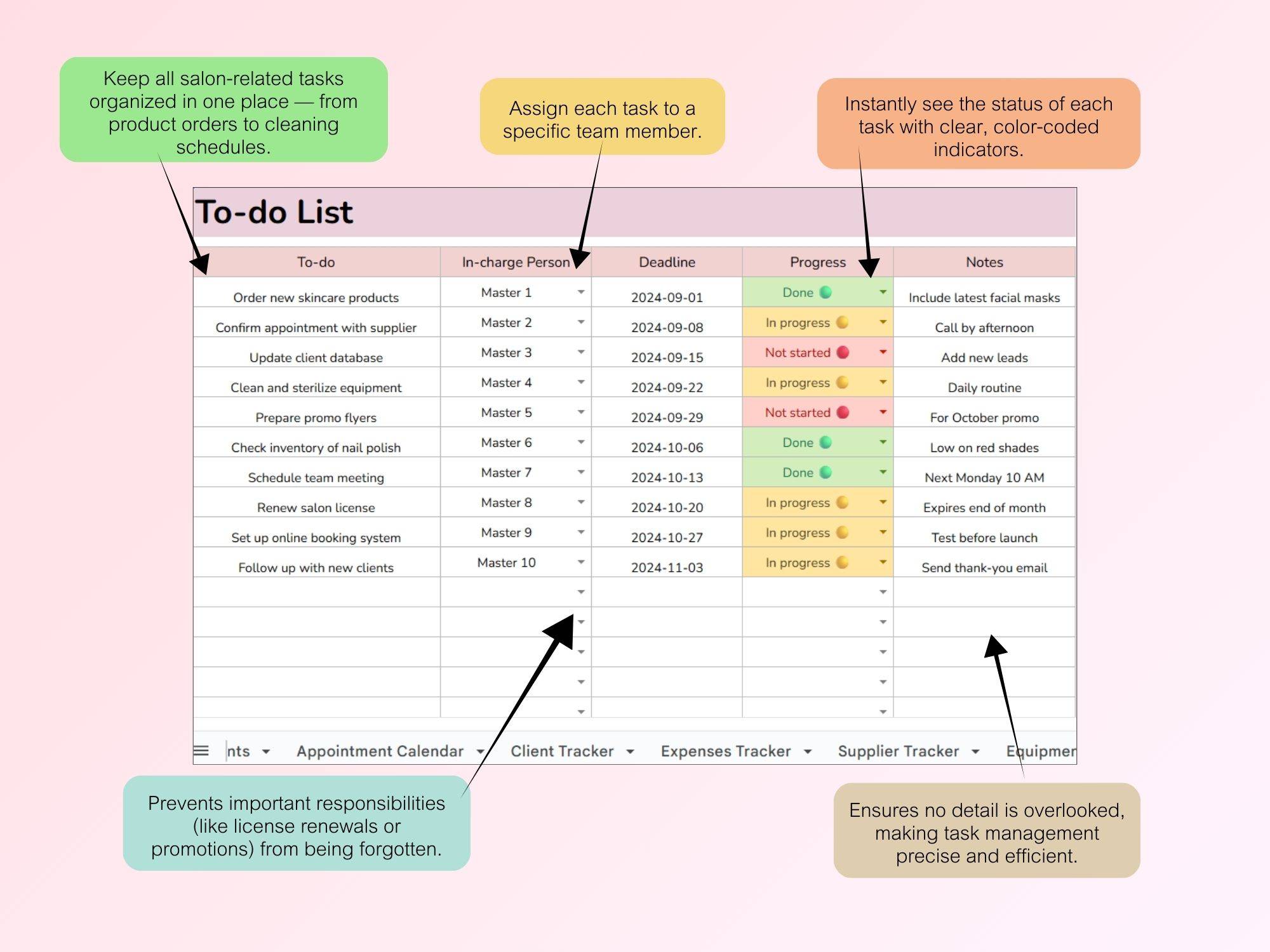 To-Do List – Assign tasks to staff, set deadlines, and monitor progress — all color-coded for clarity.