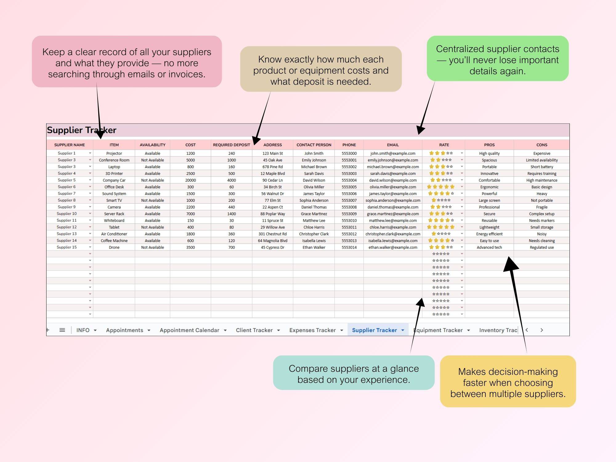 Supplier Tracker – Manage supplier contacts, compare costs, and never forget who provides what.