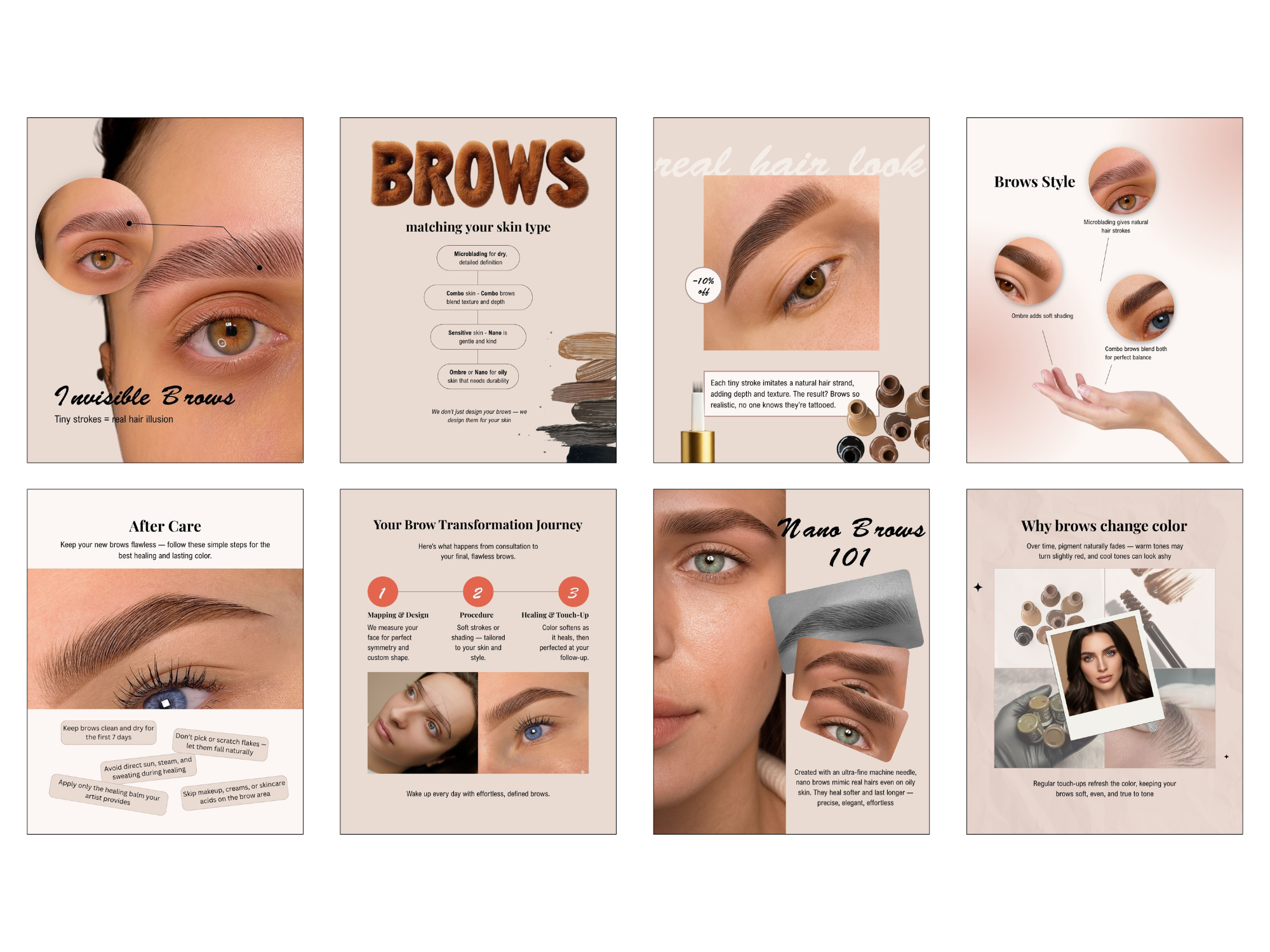 Includes posts for technique education, before & afters, client transformations, pigment selection, and brow mapping visuals.